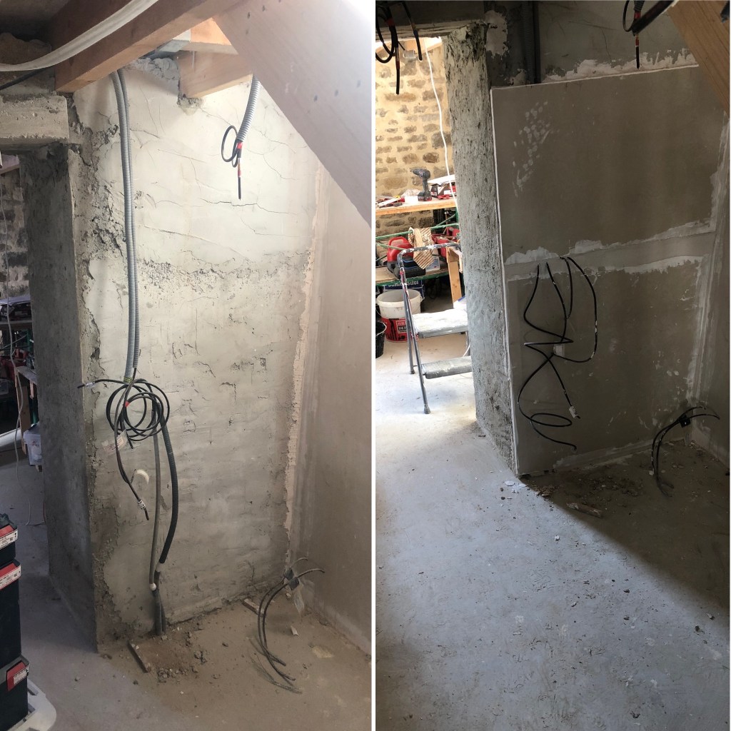 Je pensais bien terminer aujourd’hui la pose du placo restant sur le salon, mais j’ai sous-estimé le temps nécessaire à la découpe des morceaux. Avec beaucoup d’angles au niveau des portes, l’application des enduits sera aussi une opération plus longue que pour les surfaces planes des murs du salon.