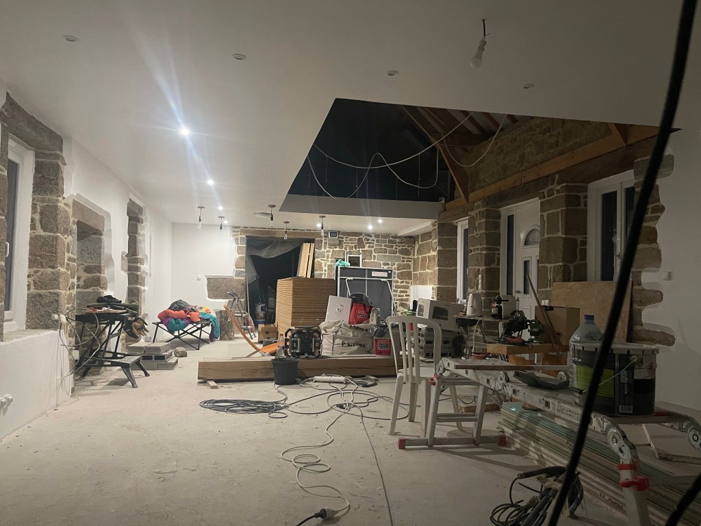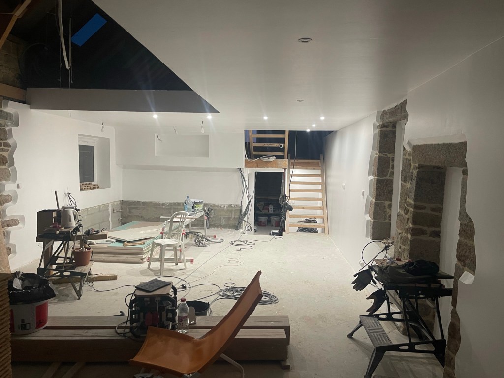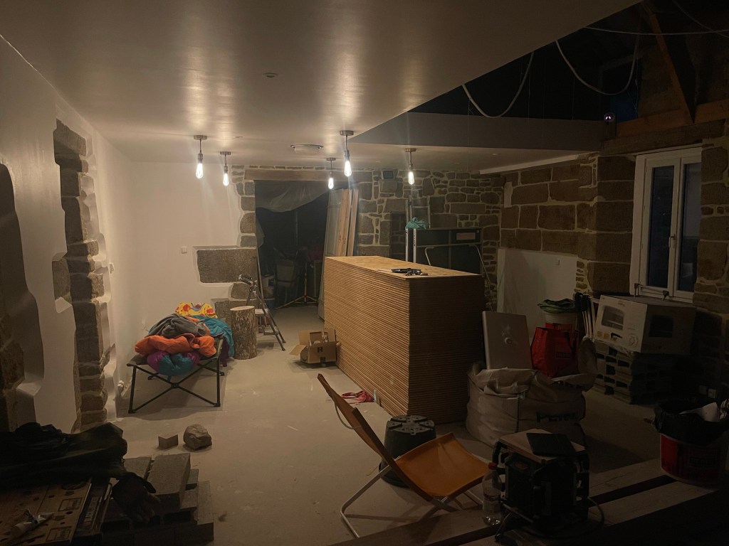 C’est une fois la pénombre tombée que l’on se rend compte du rendu de ces éclairages… Les spots encastrés éclairent vraiment bien, et le fait d’avoir prévu plusieurs zones d’éclairage devrait apporter plus de confort dans le choix des lumière (il faudra juste mémoriser les rôles de chacun des 18 poussoirs du salon!!)