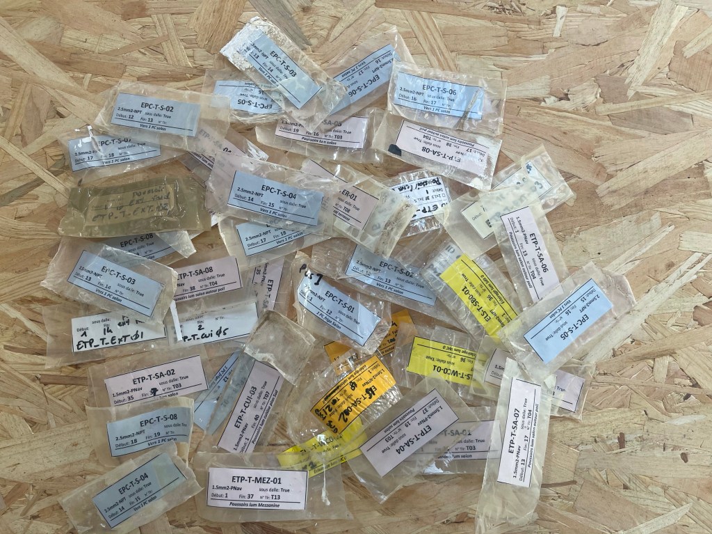 Tous ces circuits représentent un nombre important de câbles, que j’avais étiqueté le mieux possible. Au final pas de Couac, et la connexion au tableau électrique s’est bien déroulée, même si l’usage de télérupteurs pour les éclairages représente un cablâge un peu plus compliqué.