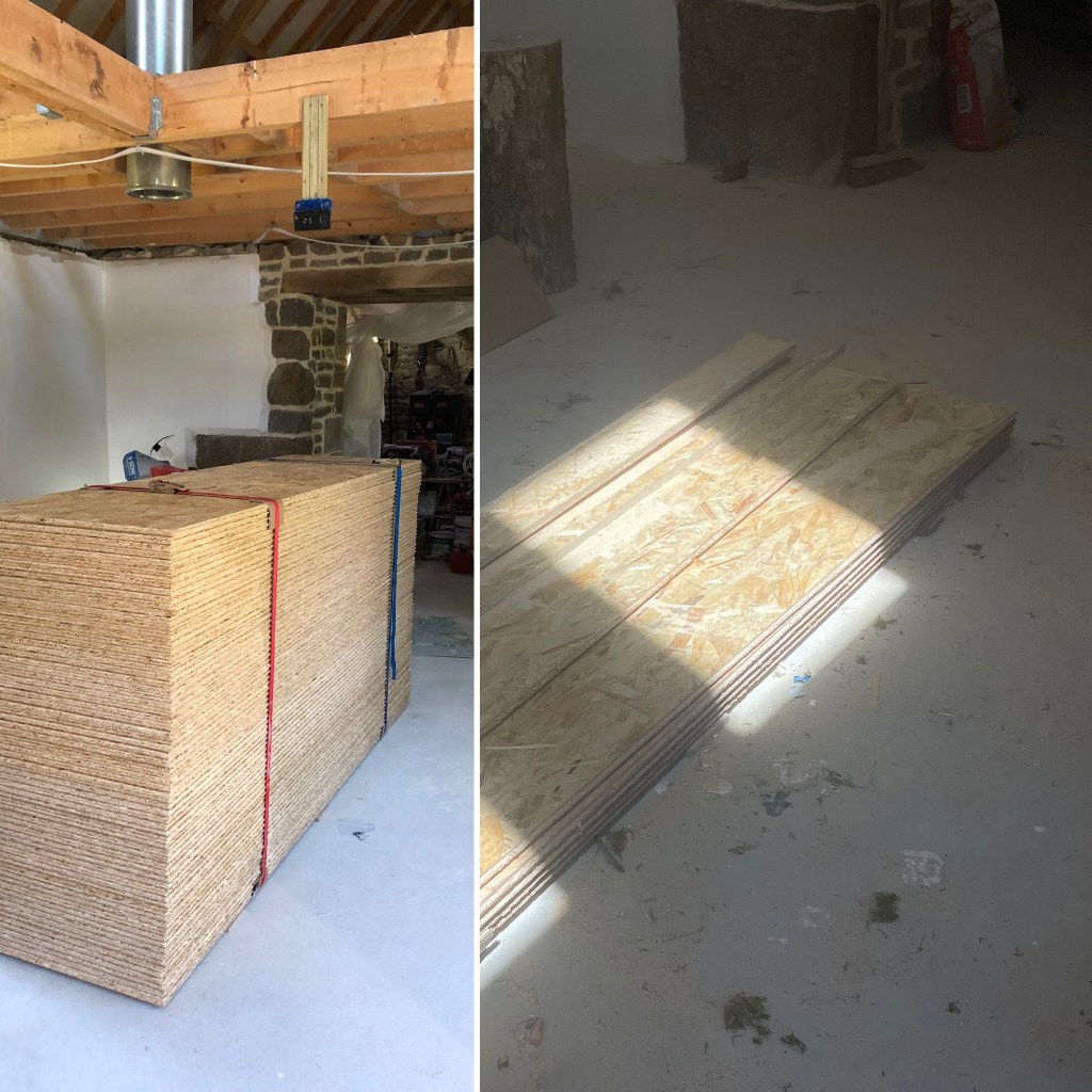 J’ai utilisé plus de 5000 clous pour environ 65 plaques d’OSB, soit quasiment une tonne de bois montée au premier étage. Le plus impressionnant est probablement la diminution de la hauteur du tas de plaque!