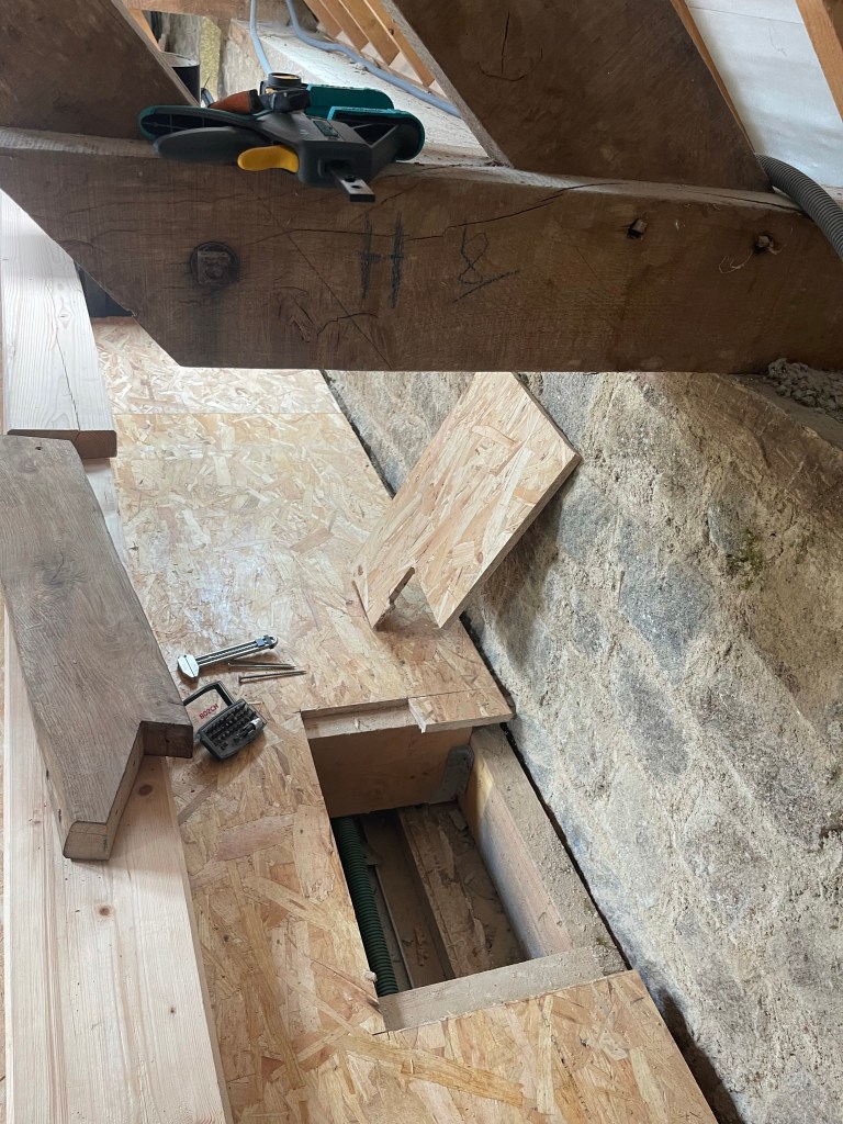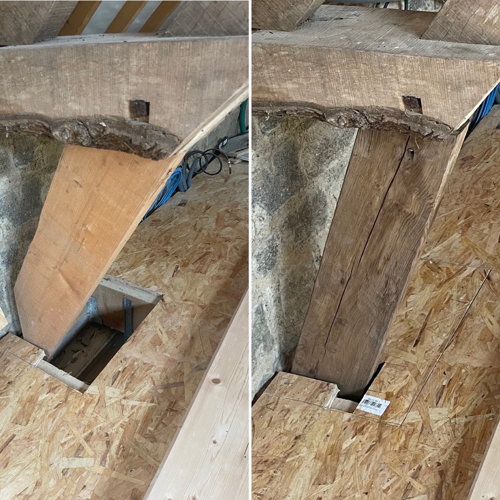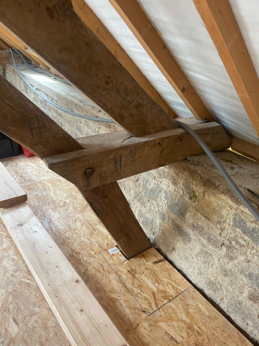 L’artisan qui nous avait refait la toiture avait rapidement fait ces jambes avec des chutes de bois des solives… du pin là où tout le reste de la charpente est en chêne. Maintenant que l’on sait où l’on va avec l’isolation des sous-pentes du toit, il est clair qu’une bonne partie des fermes resteront visibles, jambes comprises.