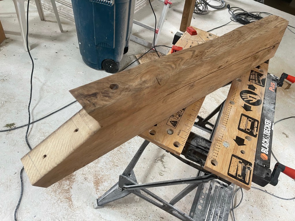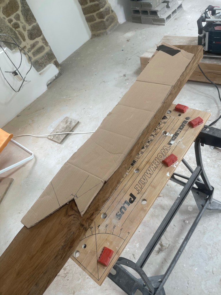 J’ai déjà poncé et traité au vermifuge des montants en chênes, il est temps de les découper et de les mettre en place!