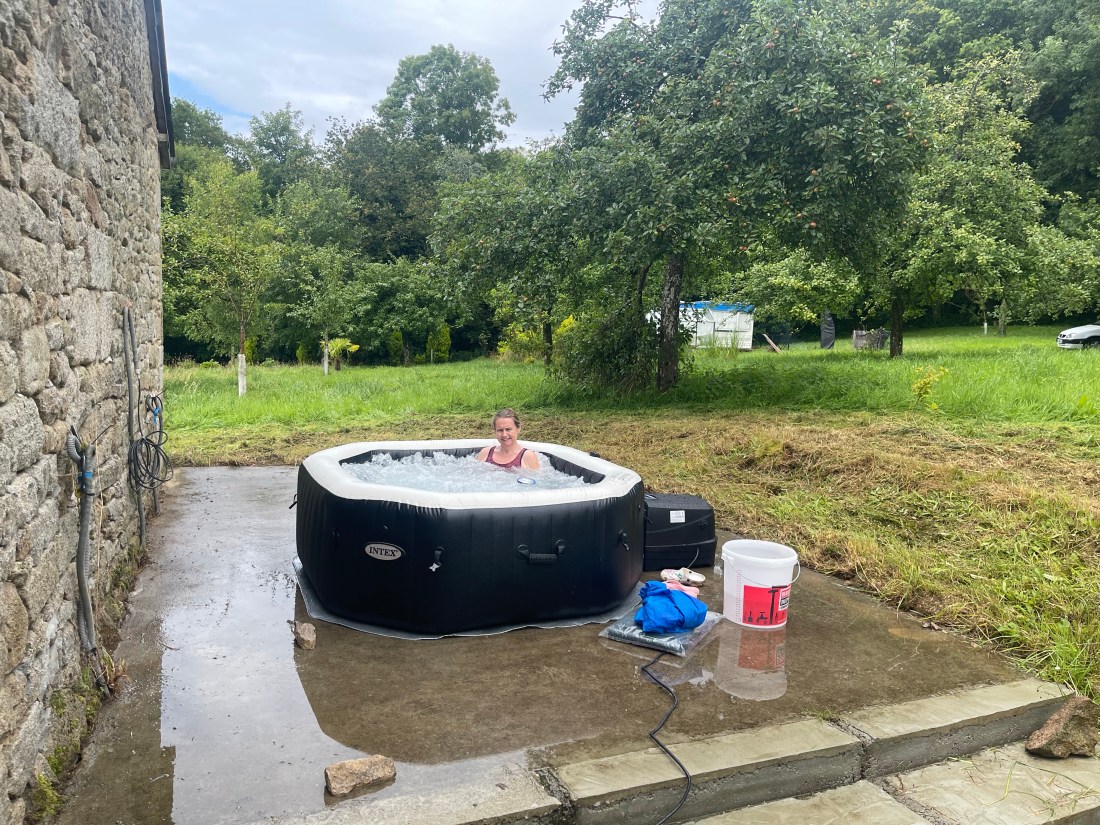 Un bon coup de ballet, et le jacuzzi peut être installé. Le gonflage est pris en charge par la pompe à air, pas trop compliqué!. Le remplissage d’eau prendra un peu de temps avant que l’on puisse commencer à tester les différentes fonctionnalités (désinfection électrolytique, chauffage, bulles et jets d’eau)