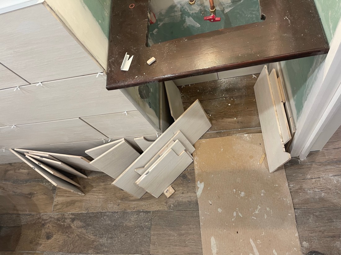 Je termine la journée en découpant les pièces que je collerai la prochaine fois… soit environ 4 rangs de carreaux pour la zone autour du lave-main.