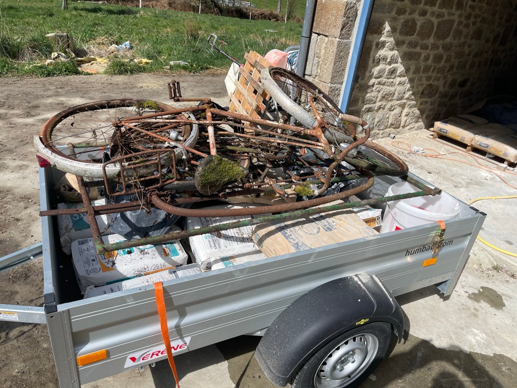La nouvelle remorque m’a permis de faire 3 aller-retours vers la déchetterie: exit la vingtaine de sac de ciment qui avaient pris l’humidité, exit les deux vélos qui rouillaient en bordure du terrain, exit la vieille piscine ensevelie sous les ronces, exit le tas de vieilles ardoises.