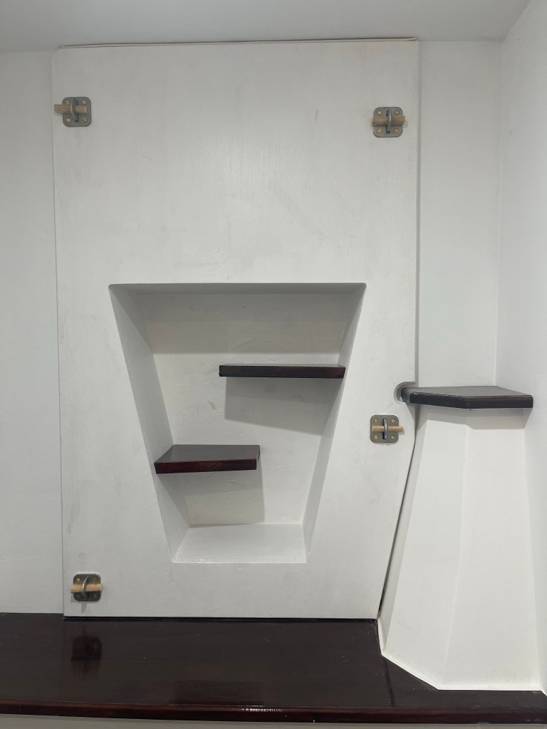 Je retourne le lendemain pour terminer les WC: l’étagère est terminée et peut être mise en place pour cacher l’ouverture vers le vide sanitaire.