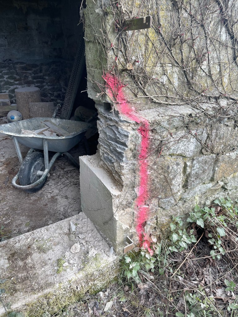 En fin d’après-midi, je m’attaque à une autre opération bruyante et très poussiéreuse: raboter 15cms sur le bas des murs de la vieille dépendance pour la remorque puisse y être stockée, à l’abri de la pluie.