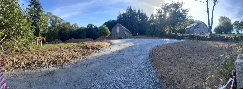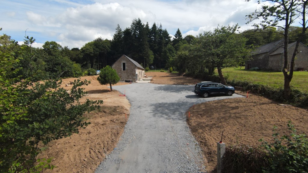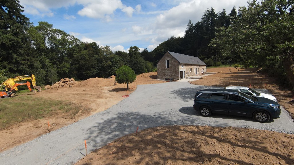 La première chose qui frappe est l’entrée sur le terrain… adieu le petit chemin tout droit, voici la nouvelle zone de stationnement pour les voitures, la sous-couche de gravier concassé est en place, bien tassée au rouleau compresseur… Une nette amélioration jusqu’à ce que l’on applique le revêtement final… il faudra être patient, ce n’est pas encore prévu.