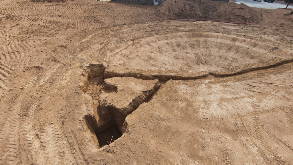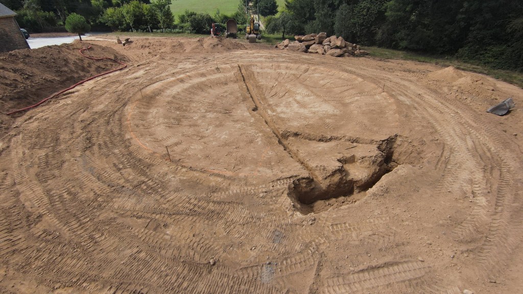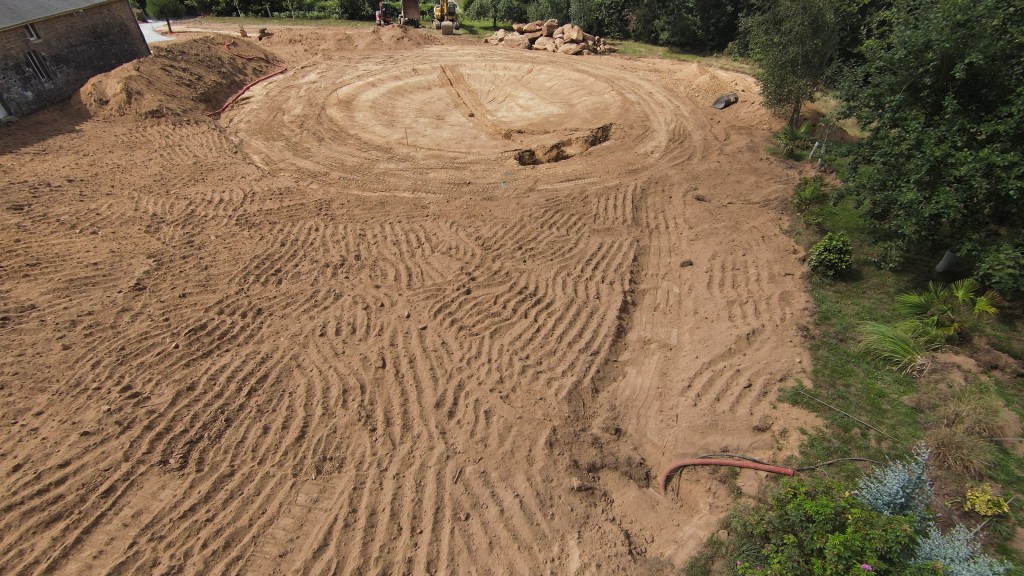 Le futur bassin est aussi bien formé, la terre là encore tassée au rouleau compresseur. Les différents paliers sont visibles pour atteindre au centre une profondeur de 1.40m. Les tranchées pour les canalisations et le local technique du bassin sont commencées.