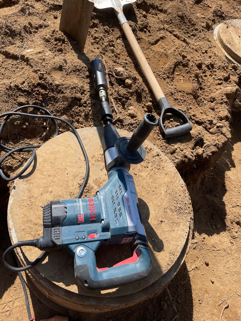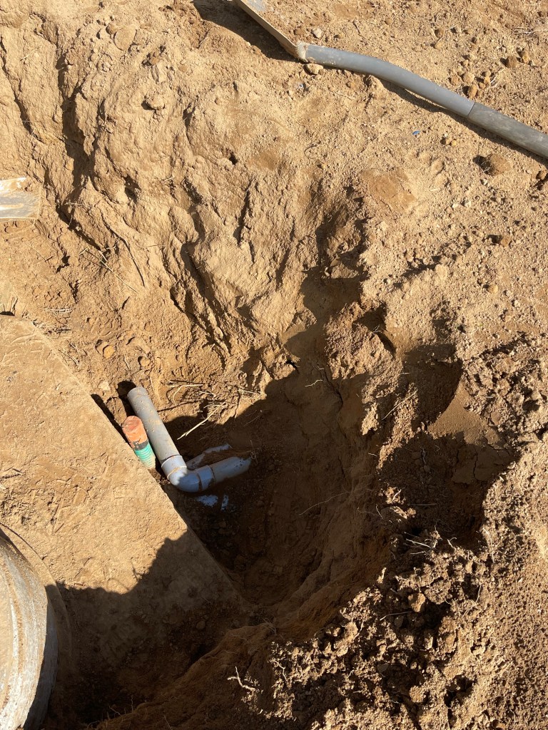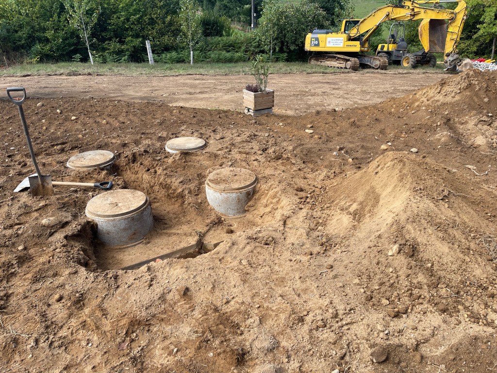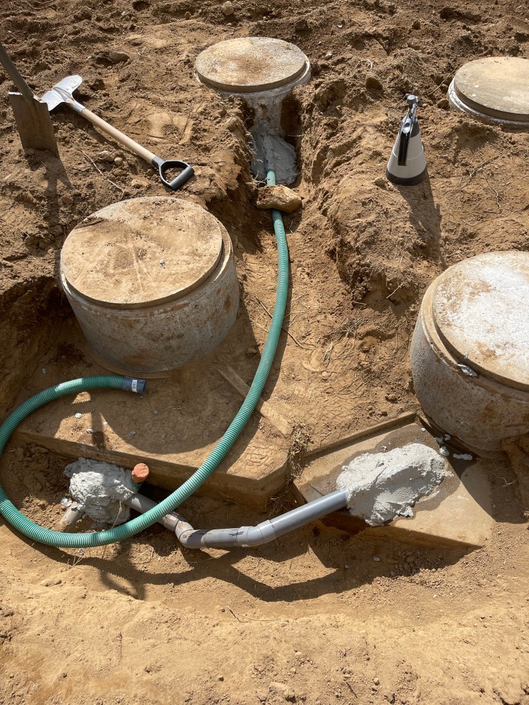 Une petite séance de pelletage me permettra de revenir au niveau des cuves, et de dégager la gaine et le tube PVC que je dois raccorder aux cuves.