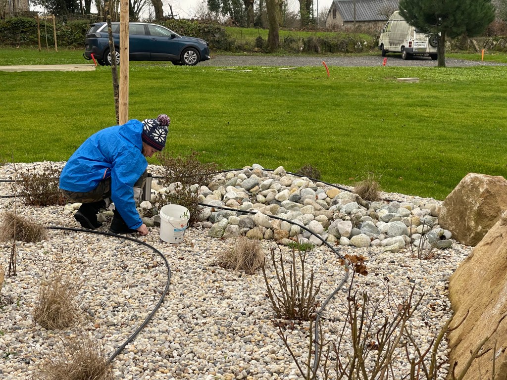 Sur ces derniers week-end, on a essayé de profiter du temps (un peu) sec pour travailler dehors. Il nous faut retirer toutes les petites herbes qui commencent à pousser sur le gravier autour du bassin. L’idée est de retirer ces pousses avant qu’elles ne colonisent toute la zone.