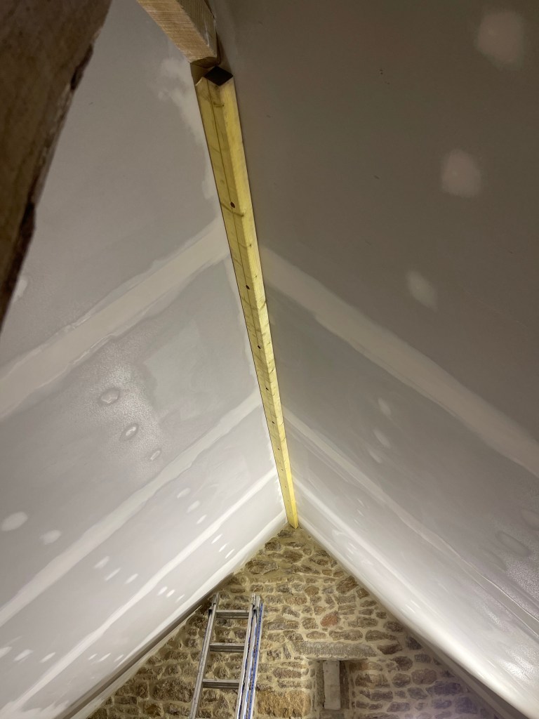 Au premier étage, la pose des cloisons pour délimiter les deux chambres des enfants a commencé. Après avoir posé les chevrons les plus pénibles (celui au niveau de l’arrête du plafond, ainsi que celui contre le mur), les montants verticaux s’enchaînent plus facilement.