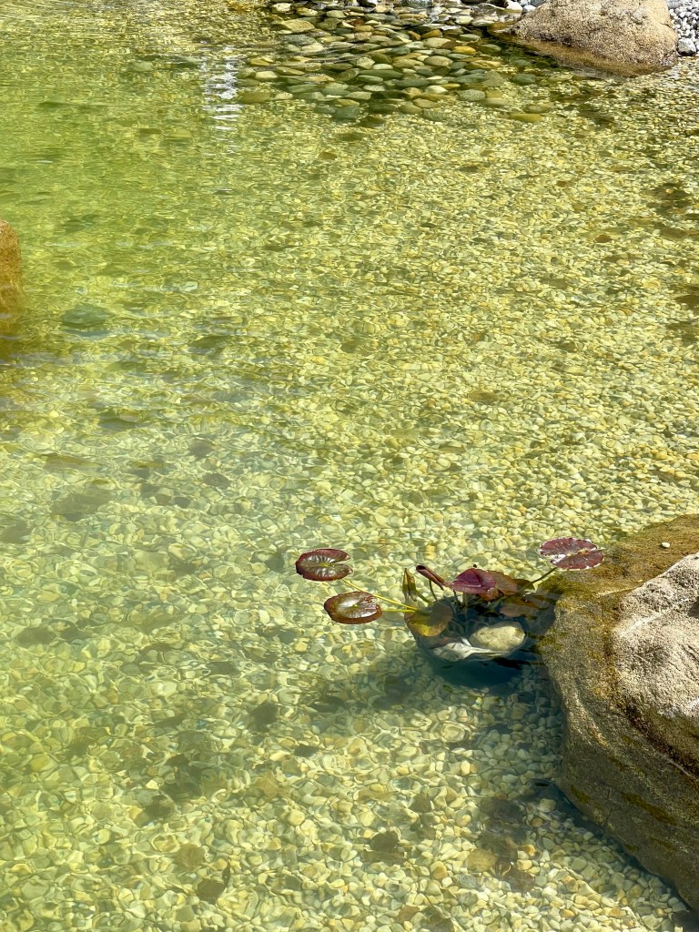 Coté occupants du bassin, depuis le lâcher des 10 premiers poissons rouges, il faut avouer que nous avions beaucoup de mal à les voir. Il faut dire que l’eau du bassin s’est troublé, possiblement à cause du pollen et des fleurs des arbres environnant. Sur conseil du paysagiste, nous avons augmenter la durée des jets du bassin, activant ainsi plus de circulation et de filtrage de l’eau… Et ce week-end, l’eau était effectivement plus claire, on a réussi a voir quelques timides poissons.