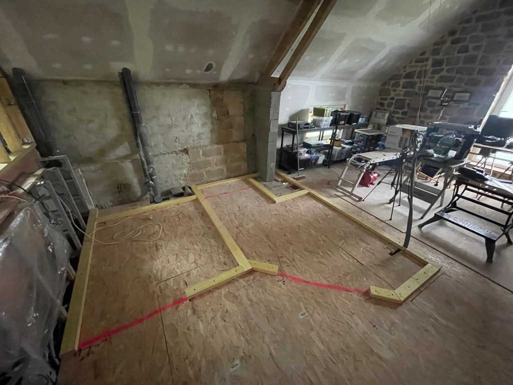 Coté intérieur, avec un jour de pluie, j’ai commencé les ossatures en bois des cloisons de la douche et des WC du 1er… pose des lisses basses.
