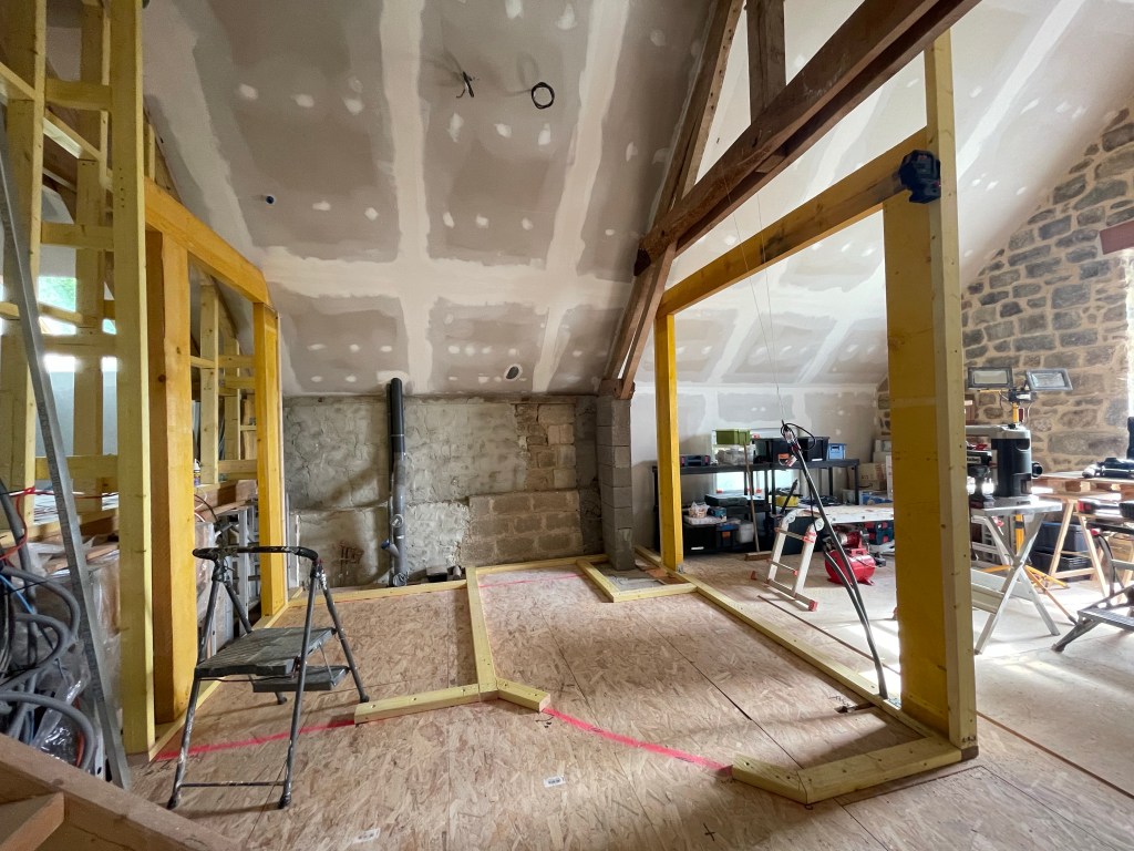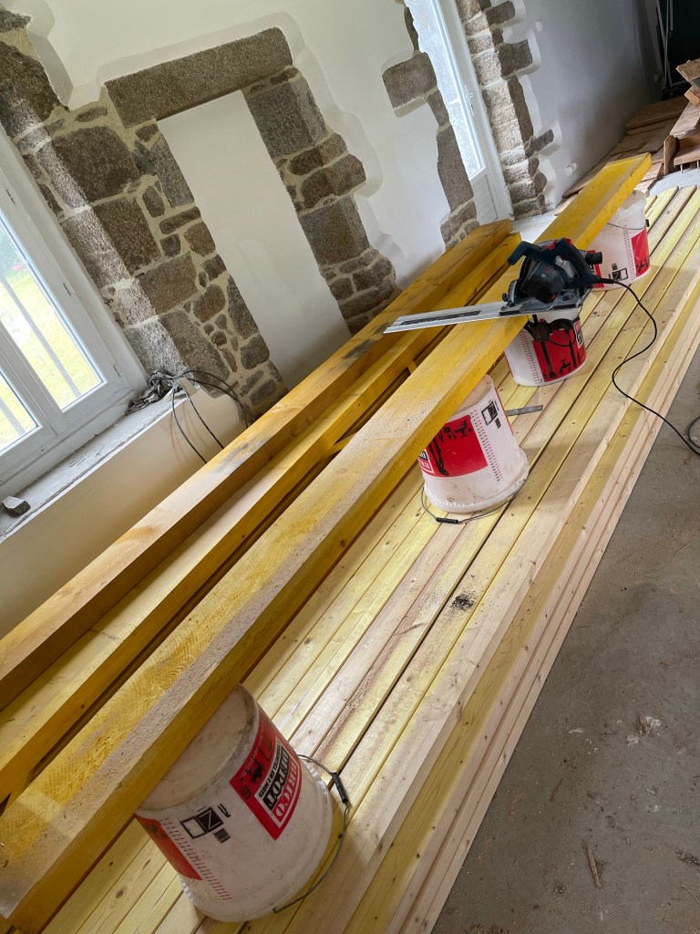 Les ossatures des cloisons du 1er ont un peu avancé, j’ai attaqué la mise en place des gros madriers pour soutenir le futur plancher.