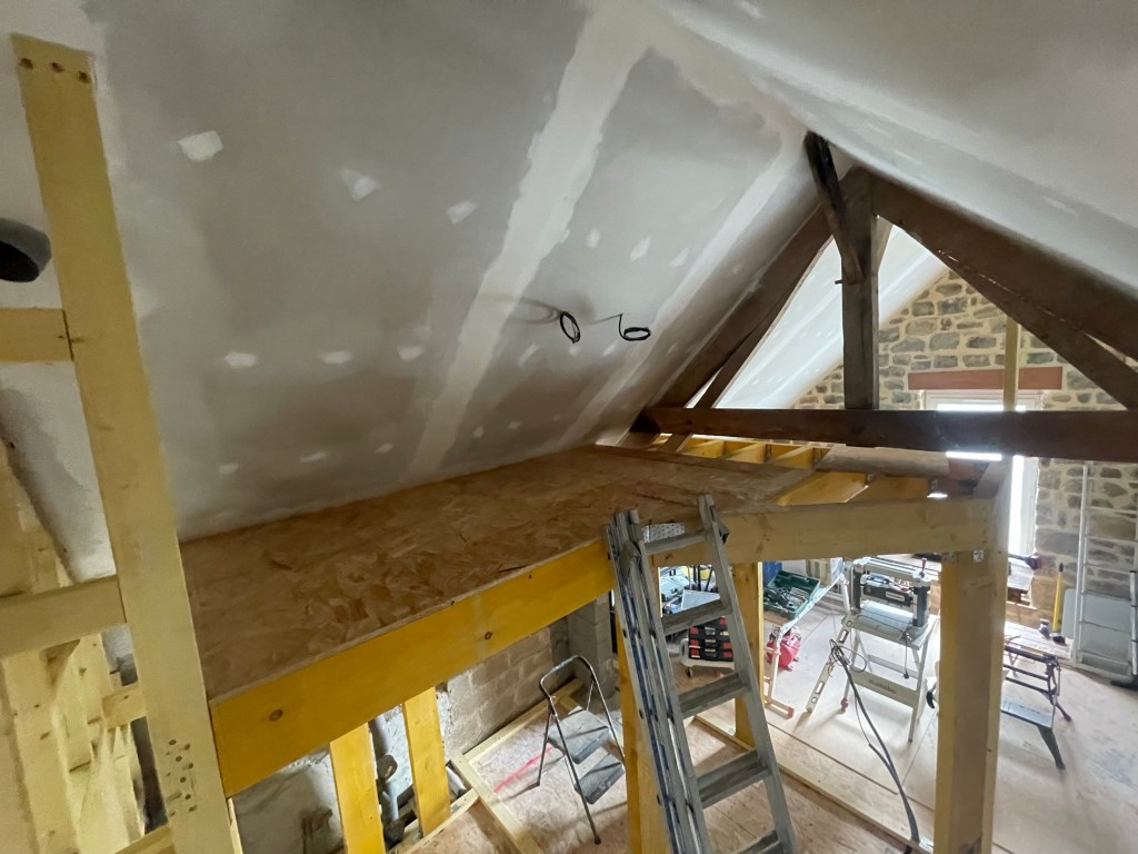 Coté travaux, j’ai attaqué la pose du plancher. Je réutilise les plaques de PCB qu’il me reste. Le plaquiste en avait utilisé pour refermer la mezzanine durant ses travaux, ce stock ne me servira plus en fin de chantier. J’optimise les ressources pour éviter d’avoir à en racheter.