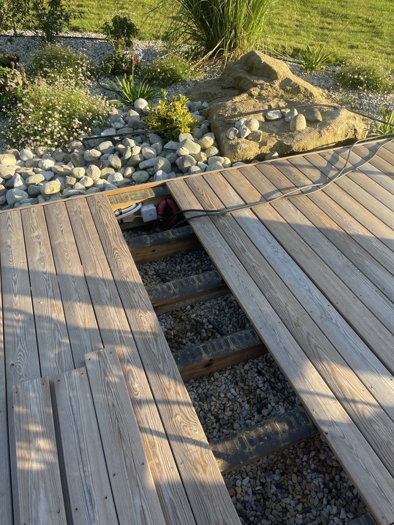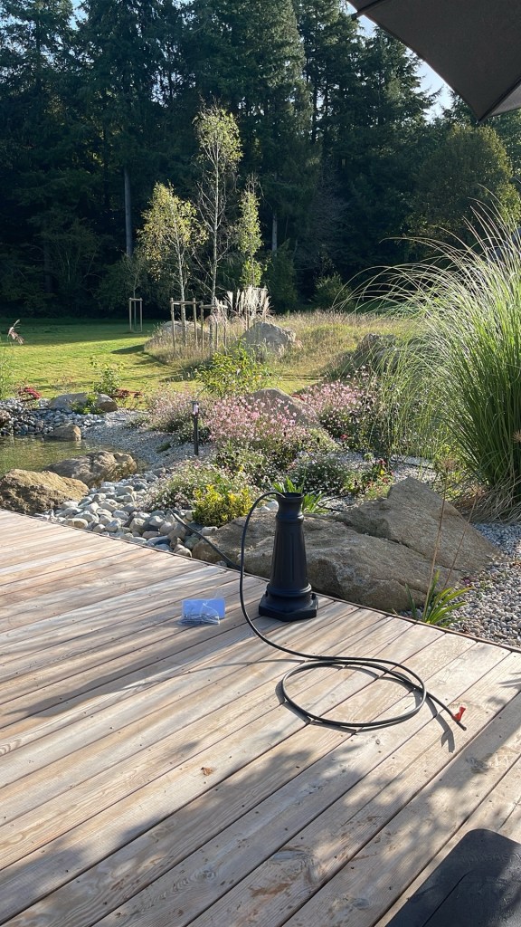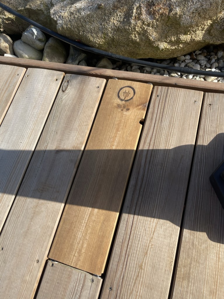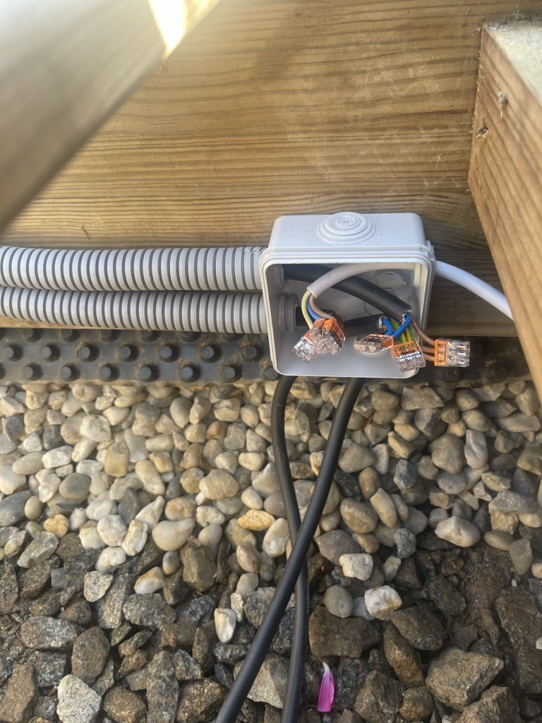 Après la pose des luminaires autour du bassin, nous avons mis en place les éléments pour la terrasse: bandeau de Led, deux lampadaires et un bloc de prise… pas grand chose finalement, mais des postures souvent peu confortables pour tous fixer sous les lattes de bois.