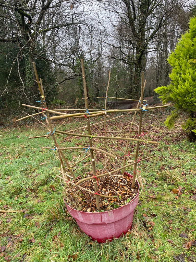 Avec Léo, on bricole un support pour la glycine qui semble avoir bien repris dans l’un des deux gros pots rouge. Elle va avoir de quoi s’étendre durant les prochaines années.