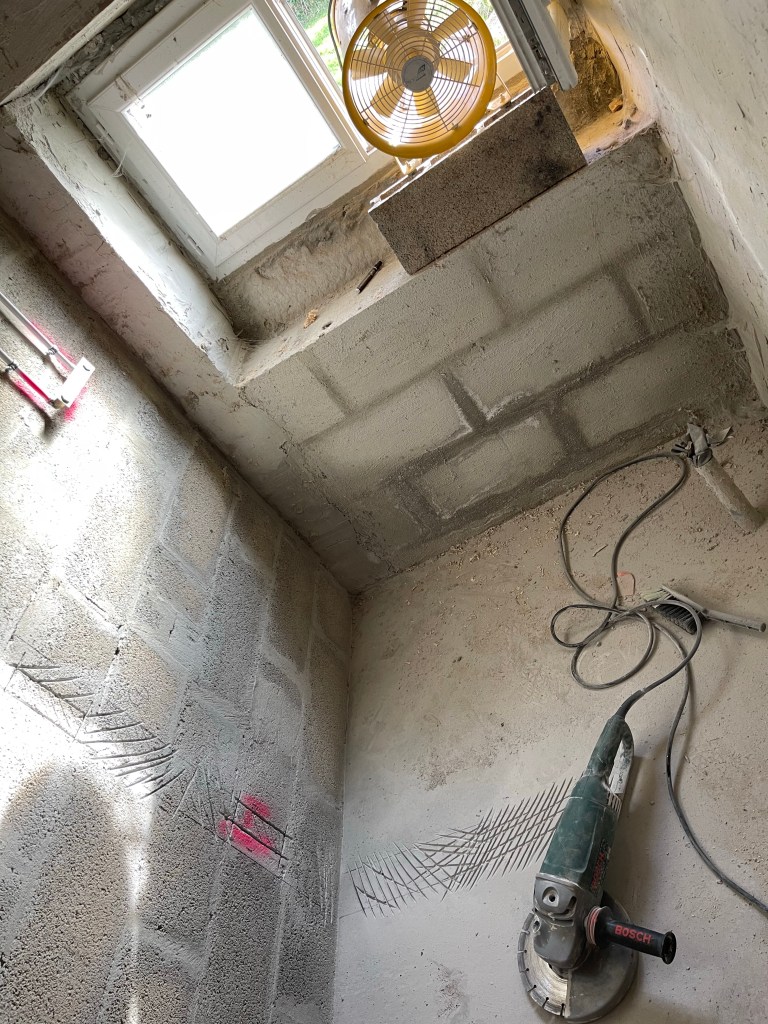 Coté travaux intérieur, j’ai ré-enduit au mortier ciment-chaux une dernière partie de mur à proximité de la zone refaite par le maçon. Pas besoin de peaufiner, une cloison viendra cacher ces parties, mais au moins, je peux commencer à passer tous les tuyaux d’eau.