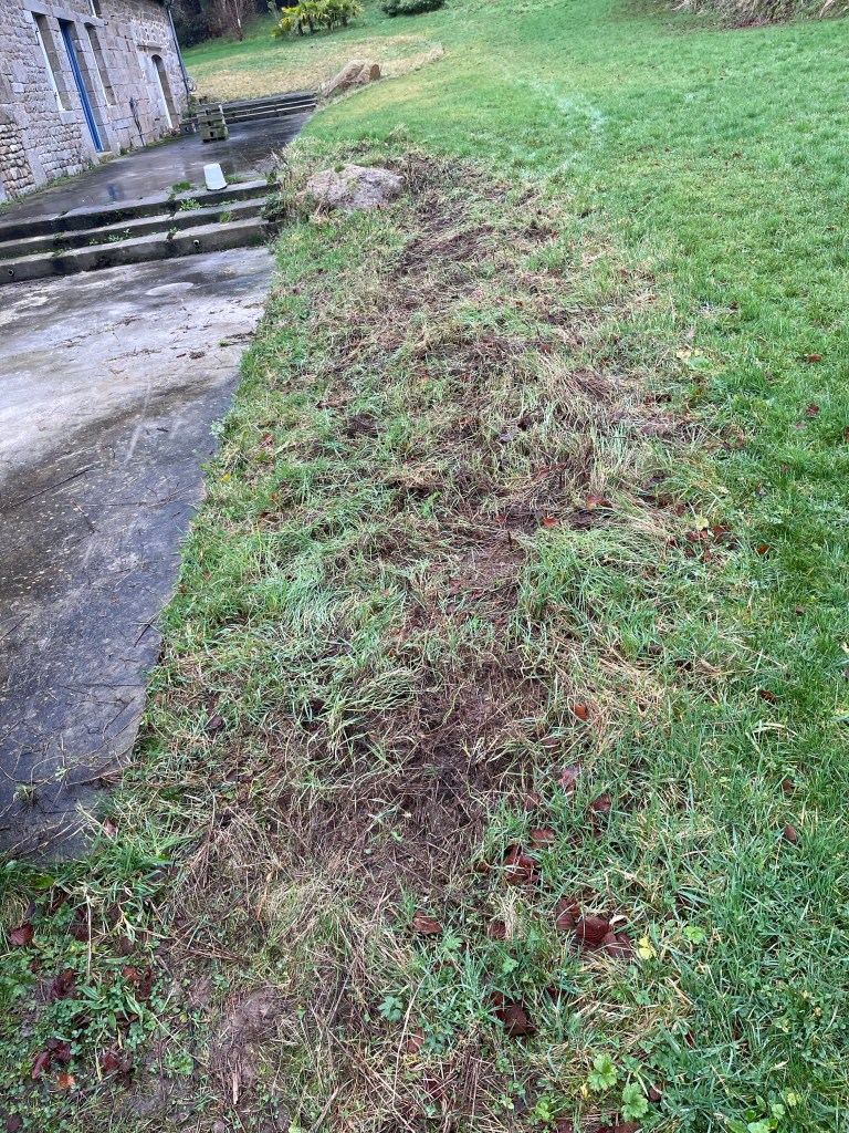 Je me décide aussi à retirer les restes d’herbes hautes que j’avais fauché il y a quelques semaines au niveau des zones de gazon fleuri. J’ai certainement attendu un peu trop, tant la végétation commence déjà à envahir les tas d’herbe. Je retire tout ça à la fourche à foin… un bon exercice de renforcement musculaire du dos!!