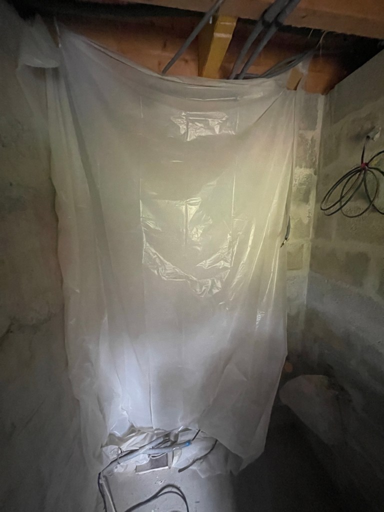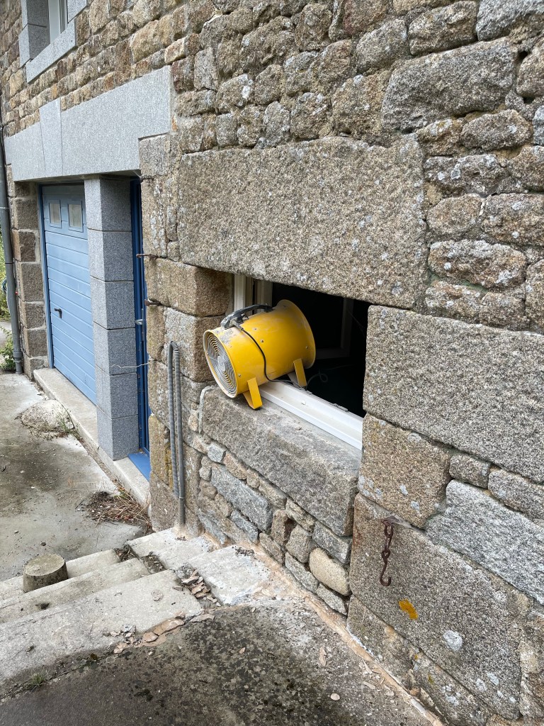 Je sais que la découpe de la dalle va générer énormément de poussière que j’aimerai bien ne pas retrouver dans la maison. Je calfeutre donc l’entrée de la douche avec une bâche plastique, et positionne mon extracteur d’air au niveau de la fenêtre.