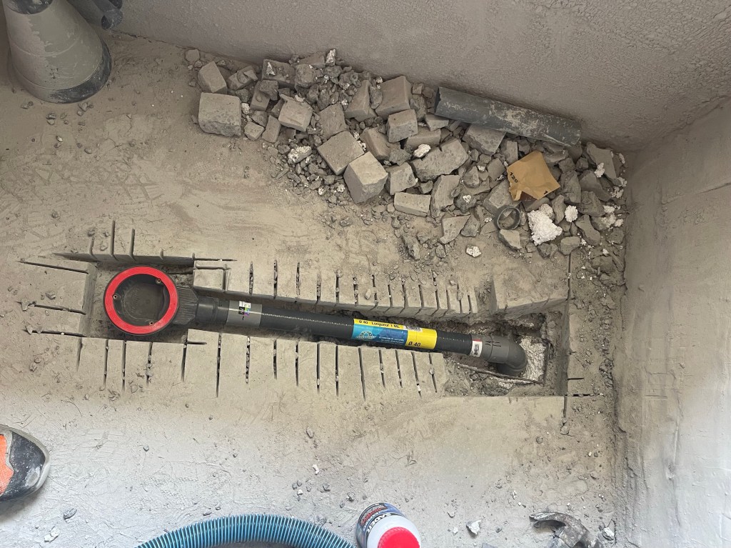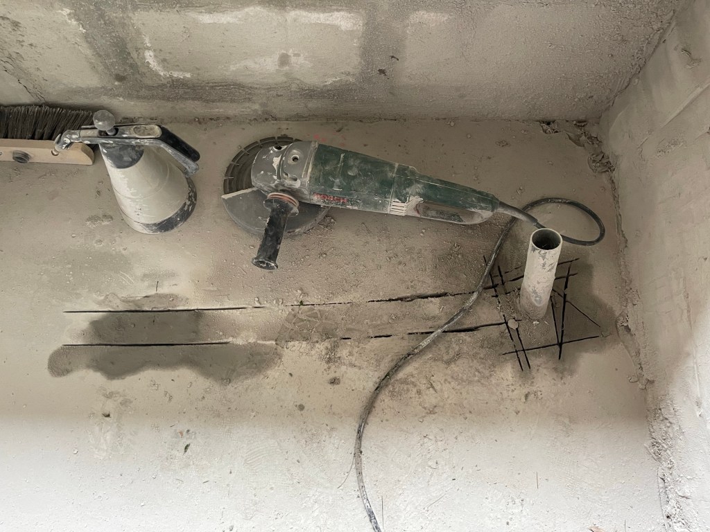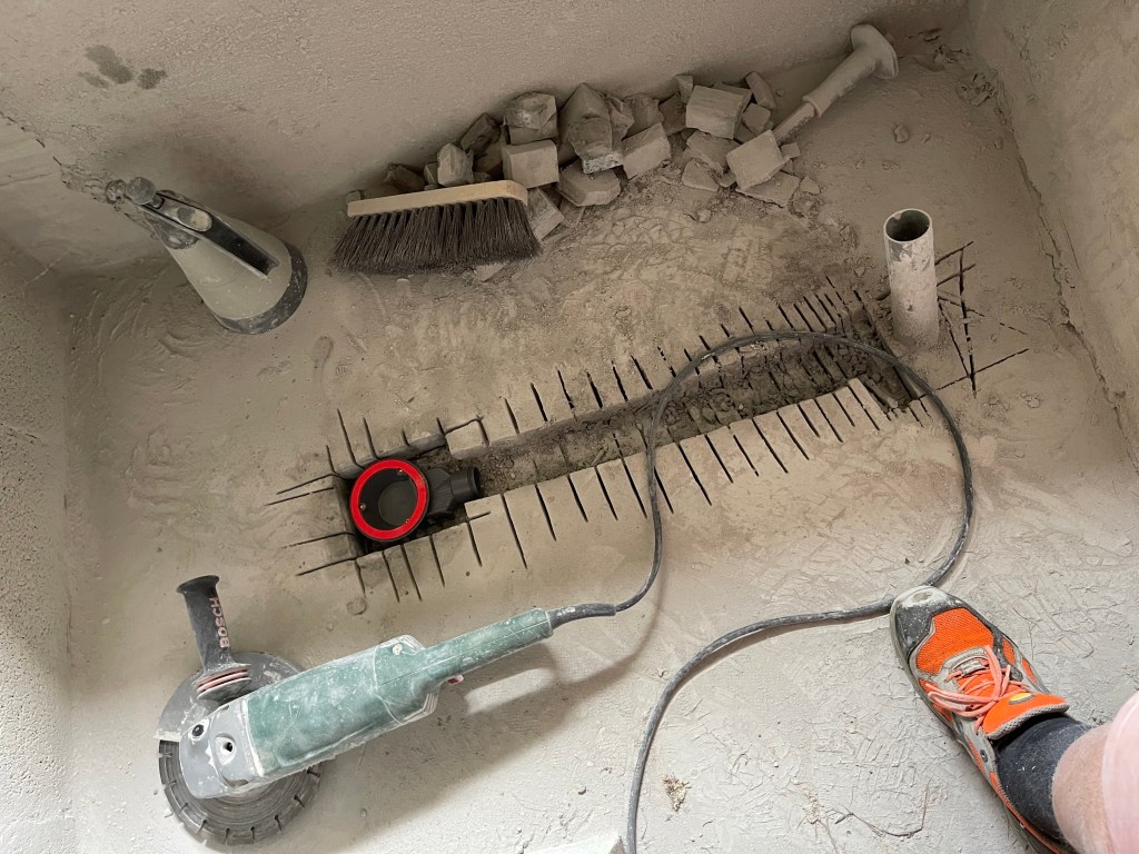 En découpant la dalle de béton, il est donc possible de déplacer la position de la bonde. Et en creusant suffisamment, on doit pouvoir inclure la bonde et le tuyau dans l’épaisseur de la dalle, pour ainsi réduire au minimum la hauteur du receveur par rapport au sol.