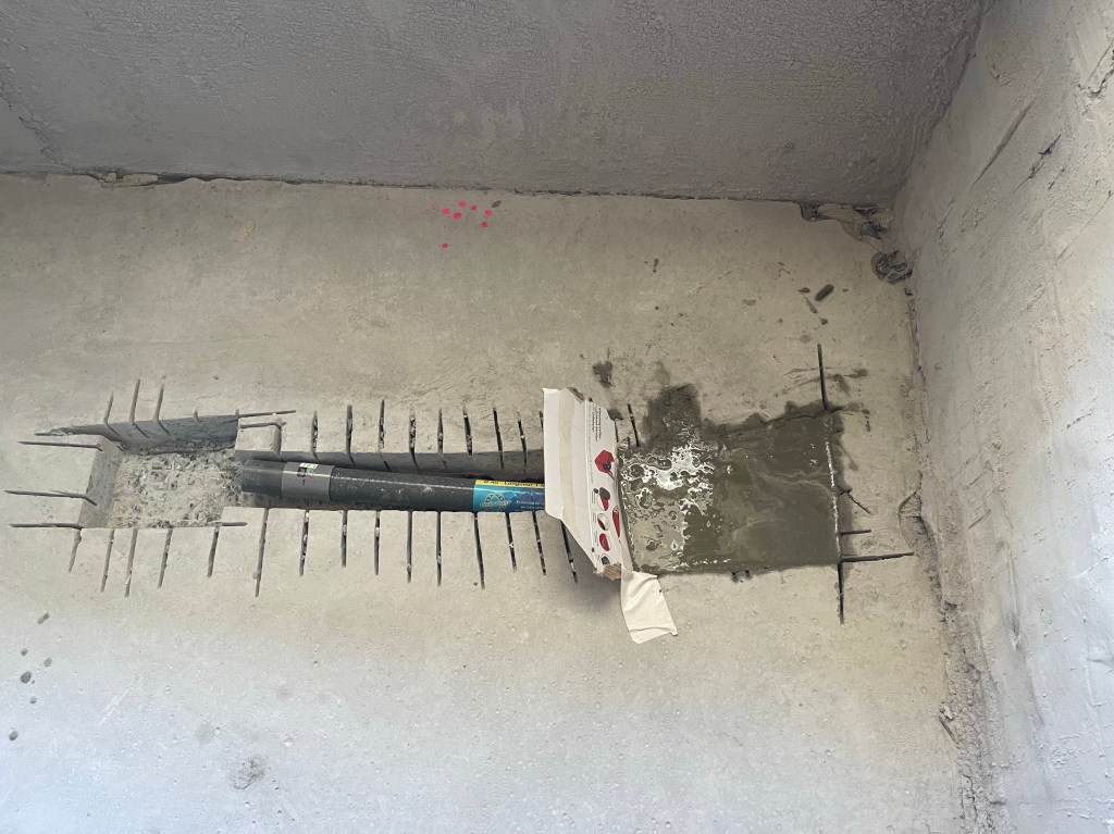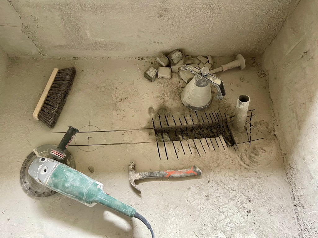 L’artisan qui va nous créer les deux receveurs de douche nous avait conseillé de modifier l’emplacement de la bonde d’évacuation pour la douche du Rez-de-chaussée.