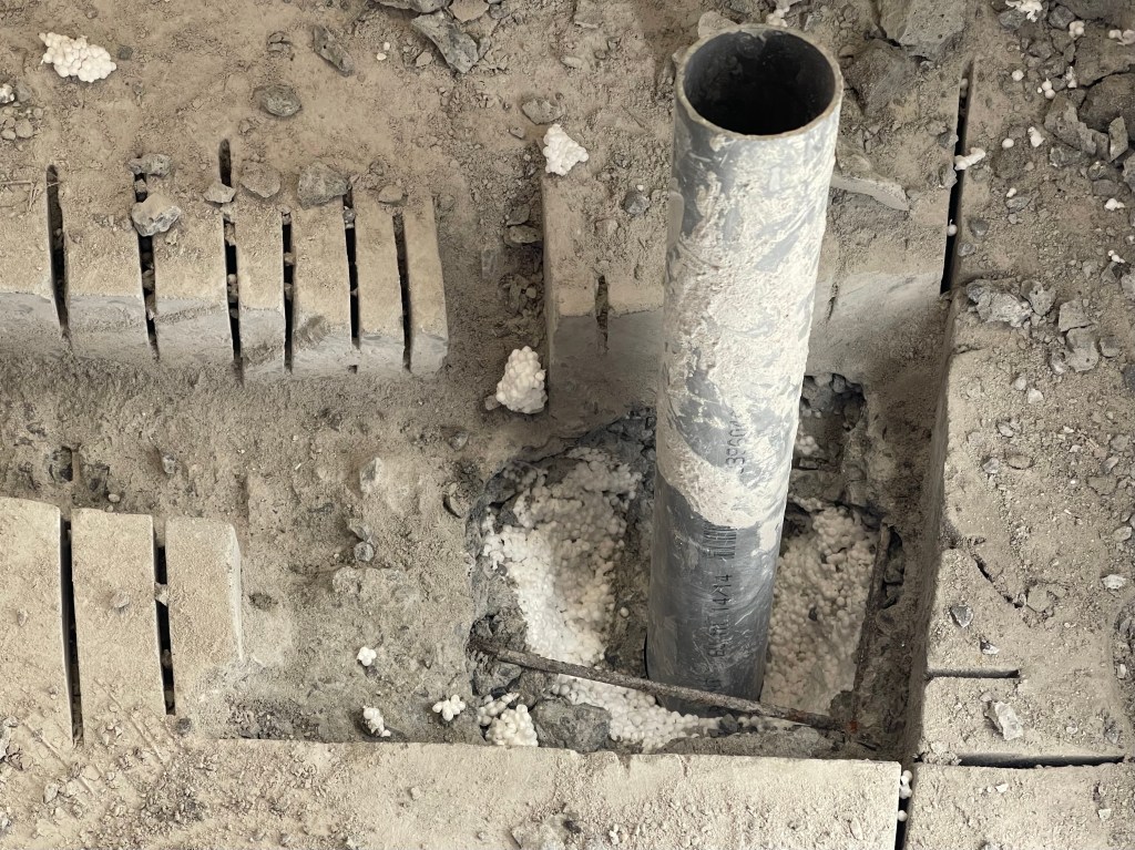 L’enjeu ensuite est de réussir à libérer le tuyau PVC du béton qui le maintient. Il faut le dégager suffisamment pour permettre la mise en place d’un coude PVC, tout en assurant la pente nécessaire à l’écoulement de l’eau. Heureusement, je réussi assez vite à percer la dalle et tomber sur la couche d’isolant.
