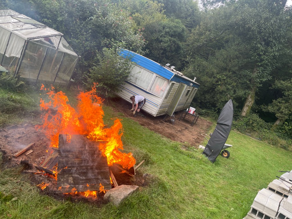 Je m’occupe de découper les lames en bois avec ma scie sabre. On fait un gros feu pour se débarrasser de ce bois en bien mauvais état. Jamais nous avions fait un feu si important, la chaleur rayonne à plusieurs mètres!