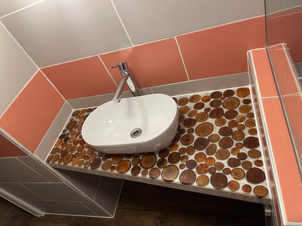 La faïence des murs posée, il est temps de mettre en place le plan en résine et la vasque.