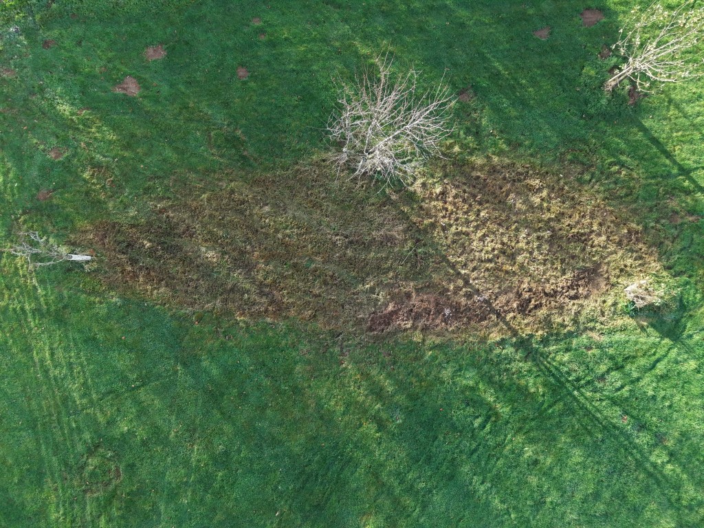 Vu d’en haut, on aperçoit un peu sur la partie de droite une zone piqueté de plein de trous de plantation.
