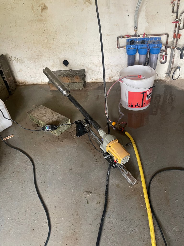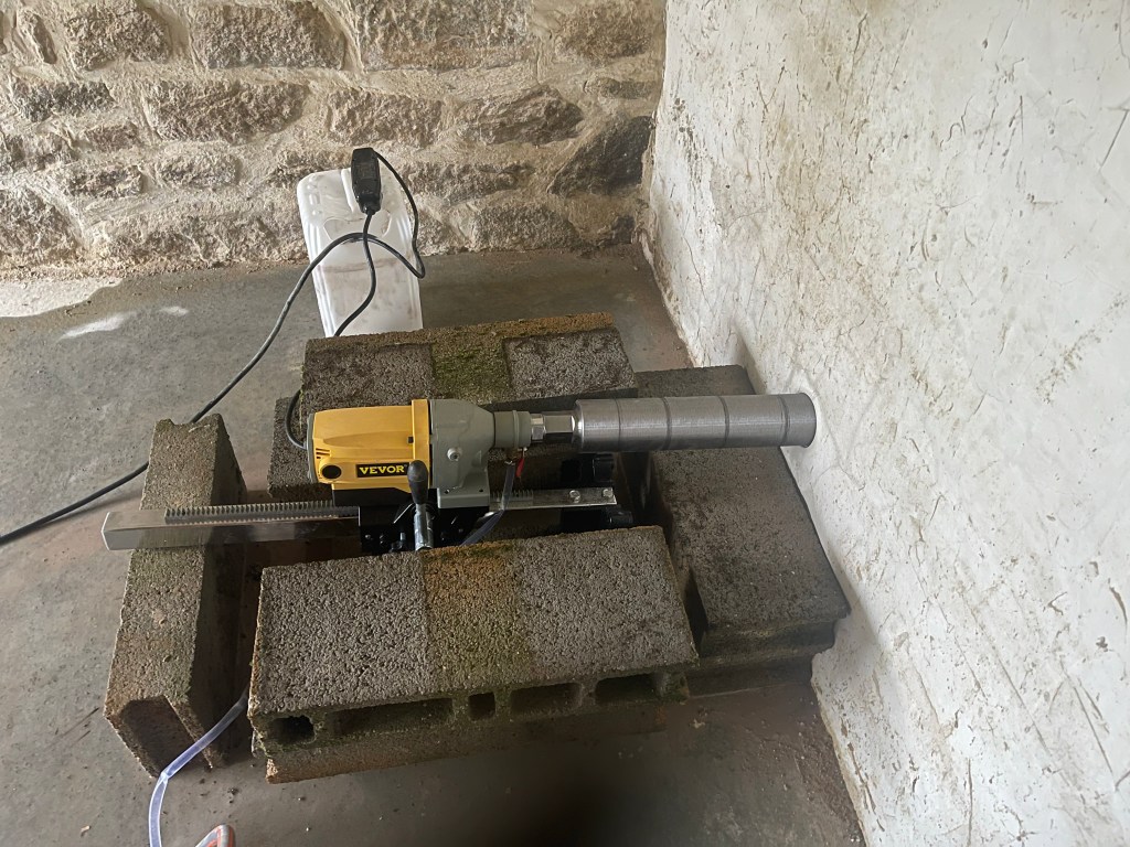 Je cale la carotteuse avec quelques parpaings, et lui connecte une arrivée d’eau pour lubrifier le trépan au diamant pendant la coupe.