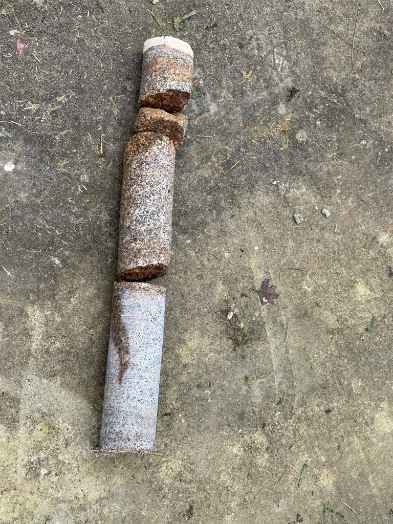 En mettant les carottes bout à bout, on voit bien les premières pierres de granit brun, et la dernière, en granit bleu qui m’a donné du fil à retordre. Mais le trou est fait, c’est une très bonne chose.
