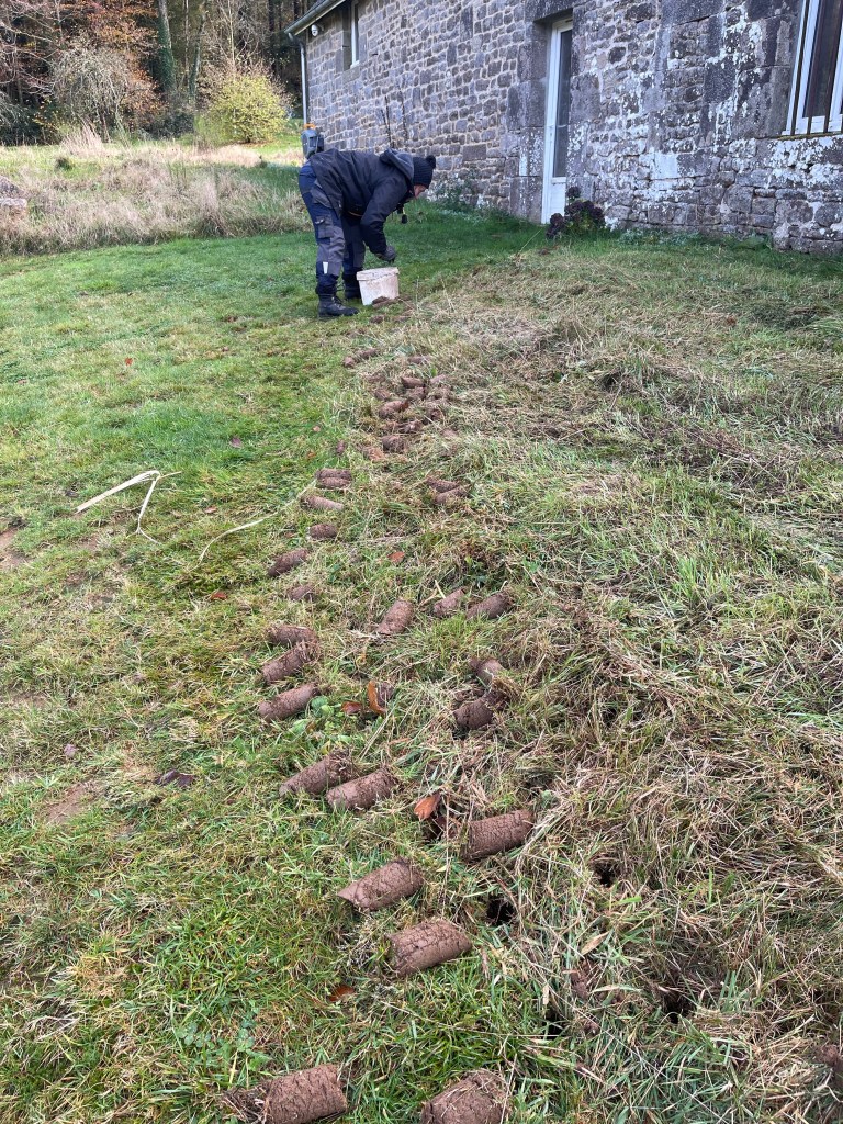 Un week-end sous le thème des trous, avec tout d’abord la mise en terre de près de 400 bulbes de narcisses et tulipes. Un petit outil bien pratique nous permet de faire les trous nécessaires sur deux zones du terrain.