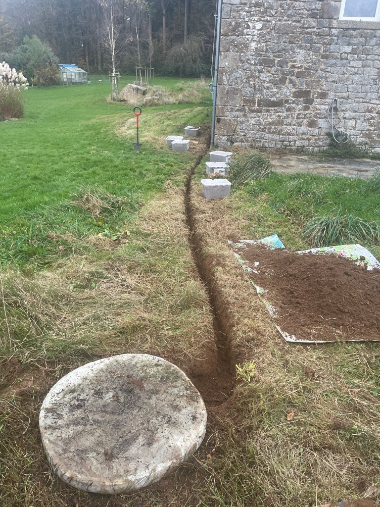 Je m’attaque ensuite à 12 mètres de tranchée entre la position du trou dans le mur et la cuve de récupération d’eau de pluie. Un autre type de trou qui m’aura occupé la journée entière!