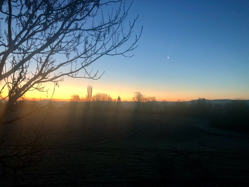 Le début de cette journée d’hiver a été très sympa, avec une lumière de lever de soleil sur une campagne blanche de givre. En arrivant, c’est toujours le givre qui blanchit le terrain… Il n’y a (malheureusement) plus de trace de la neige tombée la semaine dernière. Aujourd’hui, il va falloir s’activer pour ne pas…