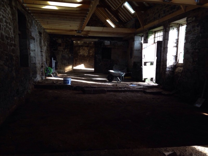 La terre ferme est maintenant visible quasiment partout dans la maison, et le sol est maintenant constitué soit de terre battue, soit de vielles chapes de ciment, ou encore de quelques grosses pierres de granit plates. Nous avons encore charié un certain nombre de brouettes de foin poussiéreux, de bois en décomposition et de pierres…