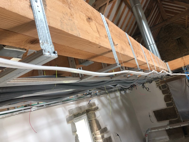 Journée de transition avant d’attaquer la pose des plaques de placo pour le plafond de la pièce principale. Je commence par installer la nouvelle station météo, incluant le capteur de température extérieur ainsi que le pluviomètre. La préparation du plafond passe par le déplacement de la « guirlande LED de chantier », elle était jusqu’alors…