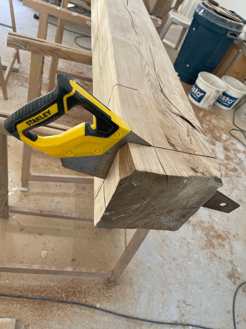 Nous avions acheté il y a plusieurs mois deux belles poutres en chêne pour faire deux poteaux de soutien des solives du coté de la cuisine. Ces deux poutres séchaient au milieu du salon. Il est temps de les mettre en place et ainsi contribuer à vider le salon. En effet, nous devrions recevoir d’ici…
