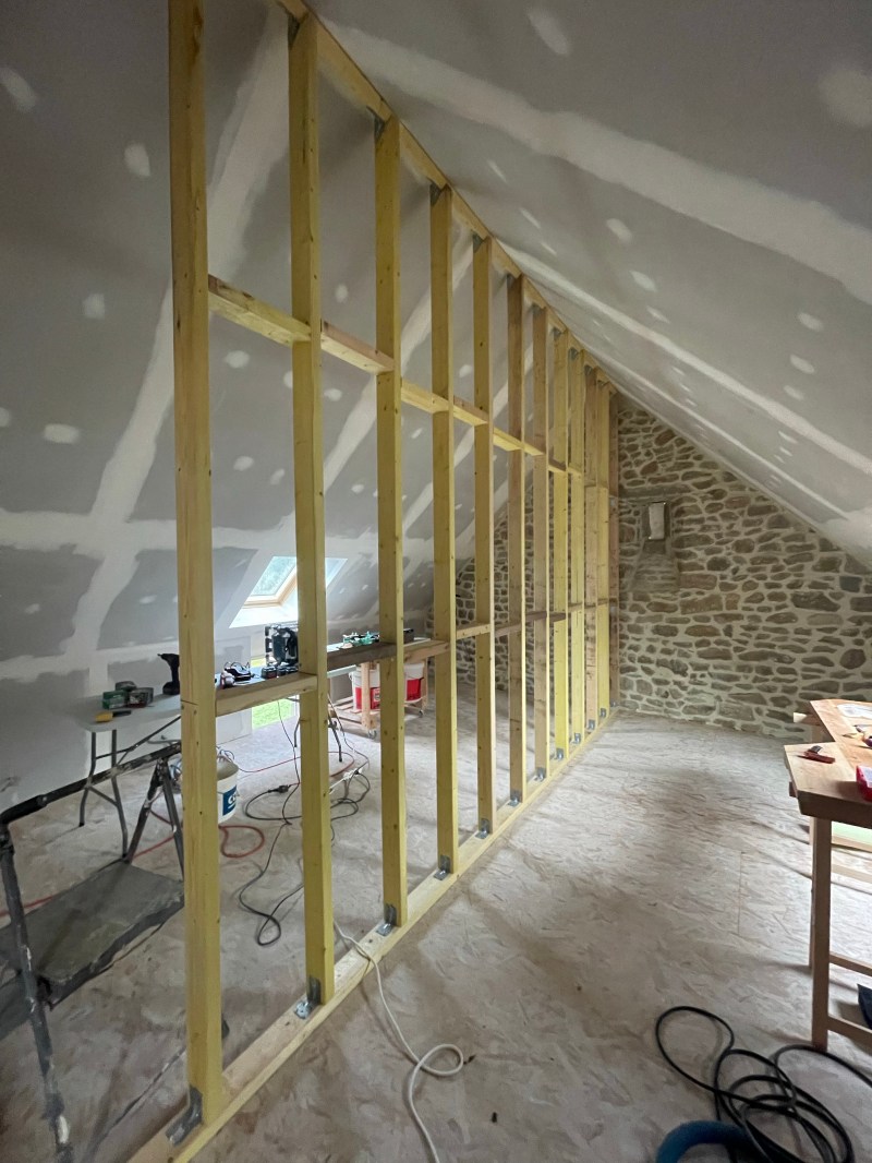Sur ce week-end de 2 jours, je m’étais fixé comme objectif de terminer toute l’ossature en bois des cloisons qui délimiteront les deux chambres des enfants. L’objectif a été tenu après deux journées bien remplies. Même si les routines sont en place, tous les outils nécessaires à portée de main, j’ai toujours l’impression de courir…