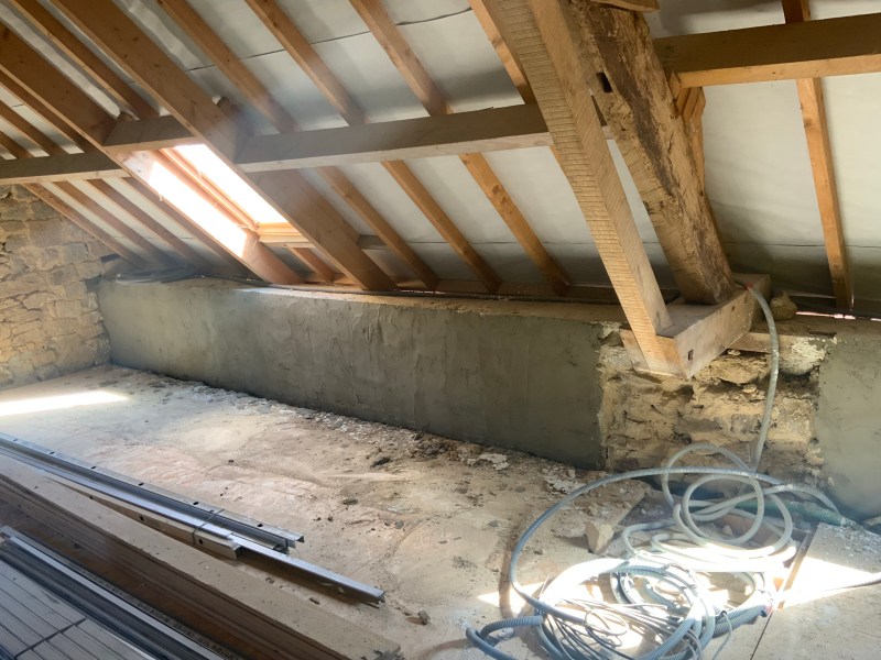 Notre artisan doit commencer l’isolation de la toiture la semaine prochaine, et je n’ai pas totalement terminé l’enduit des murs de pierre. La priorité est de faire l’enduit sur la partie Est de la toiture, c’est en effet de ce coté que l’isolation commencera en premier. La couche d’accroche appliquée il y a une semaine…