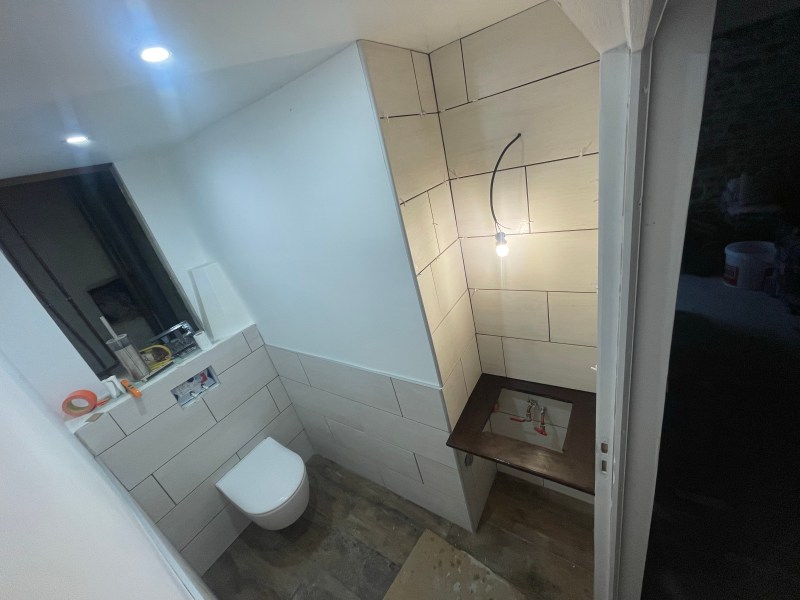 Avant d’attaquer l’étanchéité des murs de la douche, puis la pose de la faïence aux murs, il faut poser le plafond. L’espace exiguë ne permet pas l’usage de mon lève-plaques, il faut donc poser les panneaux de placo à la main. Et avec 4 mains, le travail aura été nettement plus simple! En parallèle du…