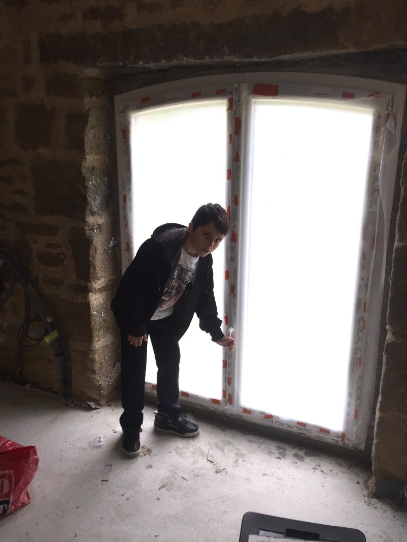 Retour à Legast où toutes les fenêtres et portes sont maintenant complètement scellées, mais deux petites imperfections nous ont bien fait rire… Des histoires de clenches bizarrement placées! Et on a enfin pu tester l’ouverture de la porte de garage… Top Du coup j’ai rentré au sec mon stock de ciment et Chaux… Presque 1200…