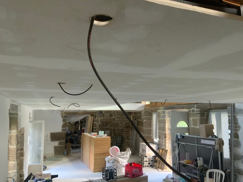 Avant de pouvoir commencer à peindre le plafond, je fais les trous de passage des spots encastrés. Au dessus du plafond et entre les solives, il s’agit de poser toutes les boites de dérivation permettant d’alimenter individuellement chacun des éclairages. La position de travail n’est pas des plus confortable, et la pose prendra plus de…