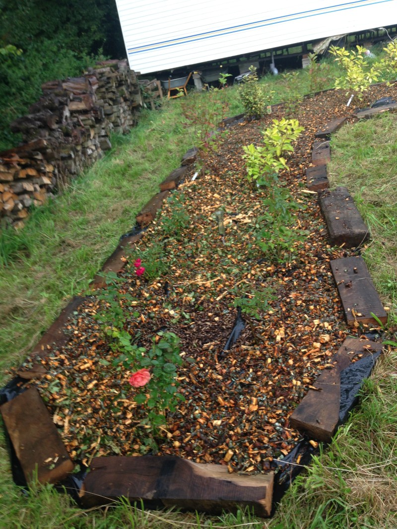 Nous avons fait un sort aux deux pommiers qui s’étaient couchés cet hiver… débitage des grosses branches, et broyage des petites…. Le désouchage sera pour la prochaine fois, tout ceci nous a bien occupé durant cette longue journée. Les copeaux nous ont servi à recouvrir le plastique noir de la haie.